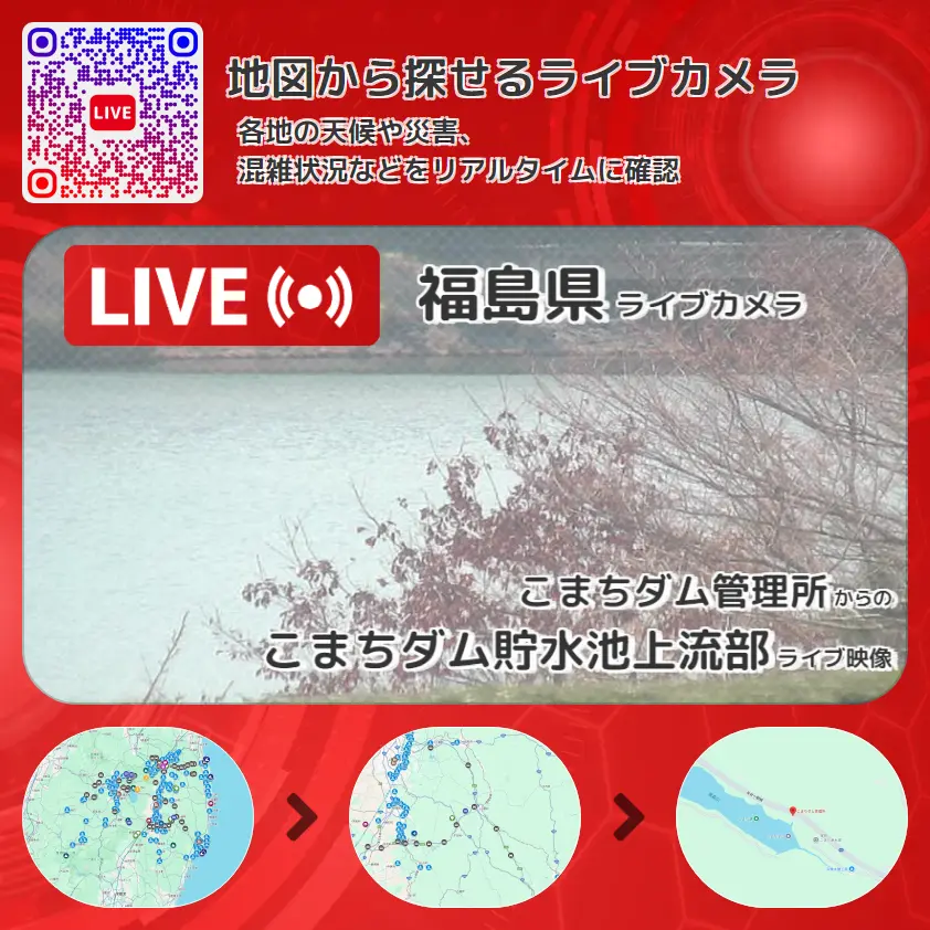 こまちダム貯水池上流部の他に、こまち湖や周辺の気象状況も併せてチェックすることが可能で、台風・大雨・地震などの災害による被害状況も把握することができます。