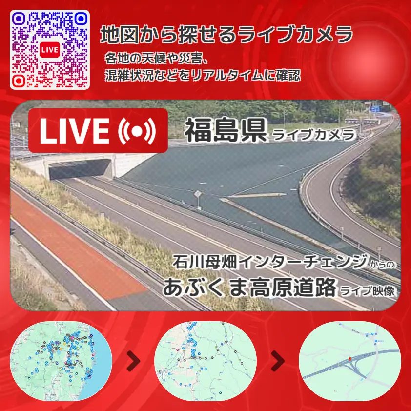 あぶくま高原道路(あぶくま高原自動車道)の他に、福島県道42号矢吹小野線や周辺の気象状況も併せてチェックすることが可能で、台風・大雨・地震などの災害による被害状況も把握することができます。