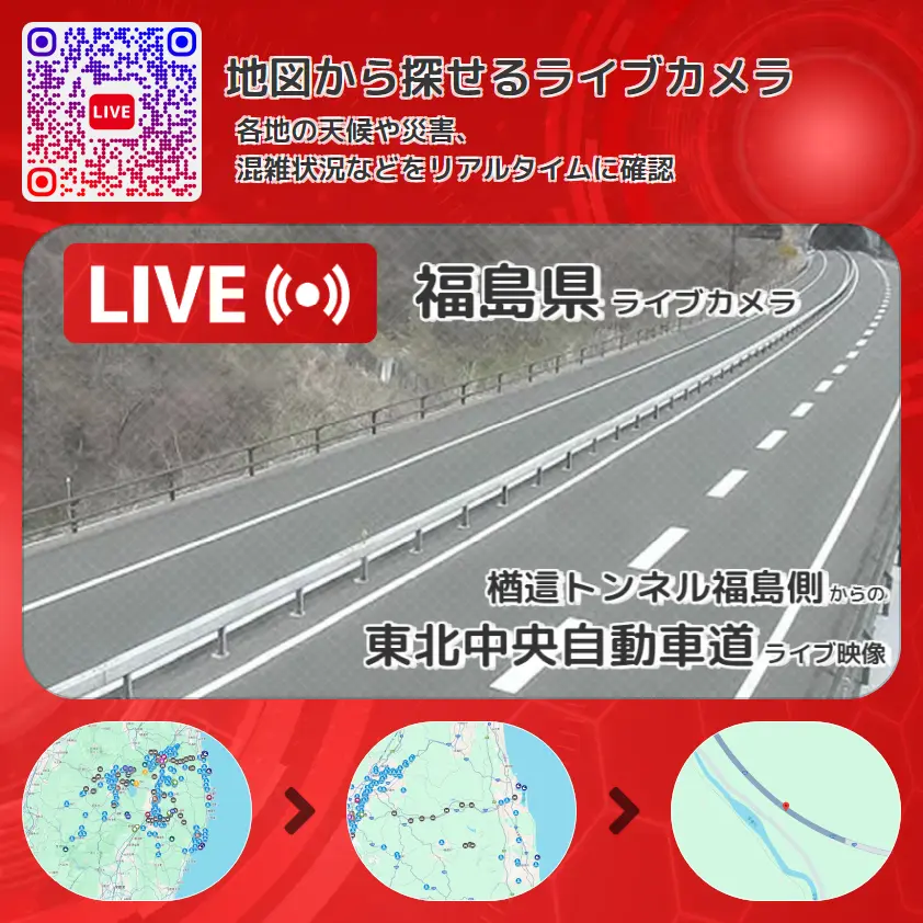 東北中央自動車道(東北中央道・東中道)の他に、楢這トンネルや周辺の気象状況も併せてチェックすることが可能で、台風・大雨・地震などの災害による被害状況も把握することができます。