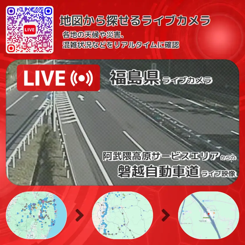 磐越自動車道(磐越道)の他に、小野インターチェンジ(小野IC)~船引三春インターチェンジ(船引三春IC)や周辺の気象状況も併せてチェックすることが可能で、台風・大雨・地震などの災害による被害状況も把握することができます。