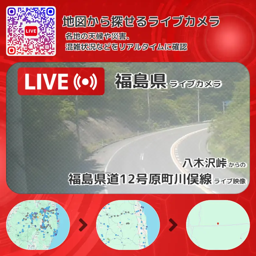 福島県道12号原町川俣線の他に、八木沢峠(原町側)や周辺の気象状況も併せてチェックすることが可能で、台風・大雨・地震などの災害による被害状況も把握することができます。