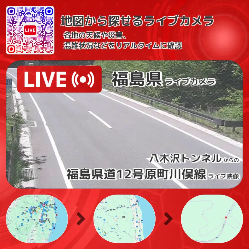 福島県道12号原町川俣線の他に、八木沢トンネル(原町側)や周辺の気象状況も併せてチェックすることが可能で、台風・大雨・地震などの災害による被害状況も把握することができます。