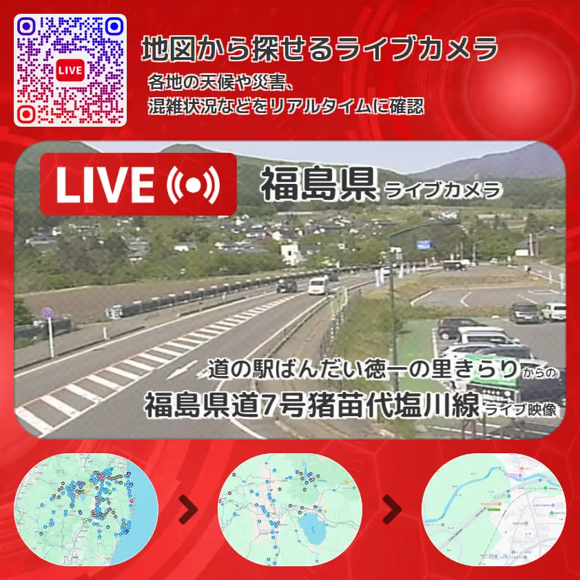 福島県道7号猪苗代塩川線の他に、磐梯山や周辺の気象状況も併せてチェックすることが可能で、台風・大雨・地震などの災害による被害状況も把握することができます。