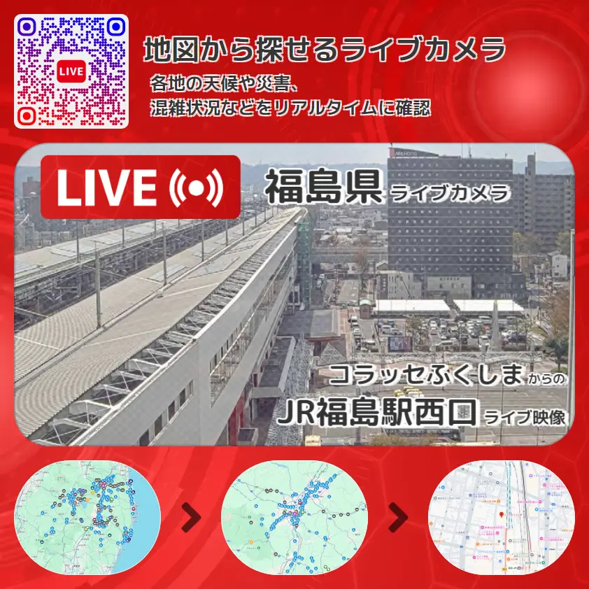 JR福島駅西口の他に、福島駅西口駅前広場整理場や周辺の気象状況も併せてチェックすることが可能で、台風・大雨・地震などの災害による被害状況も把握することができます。