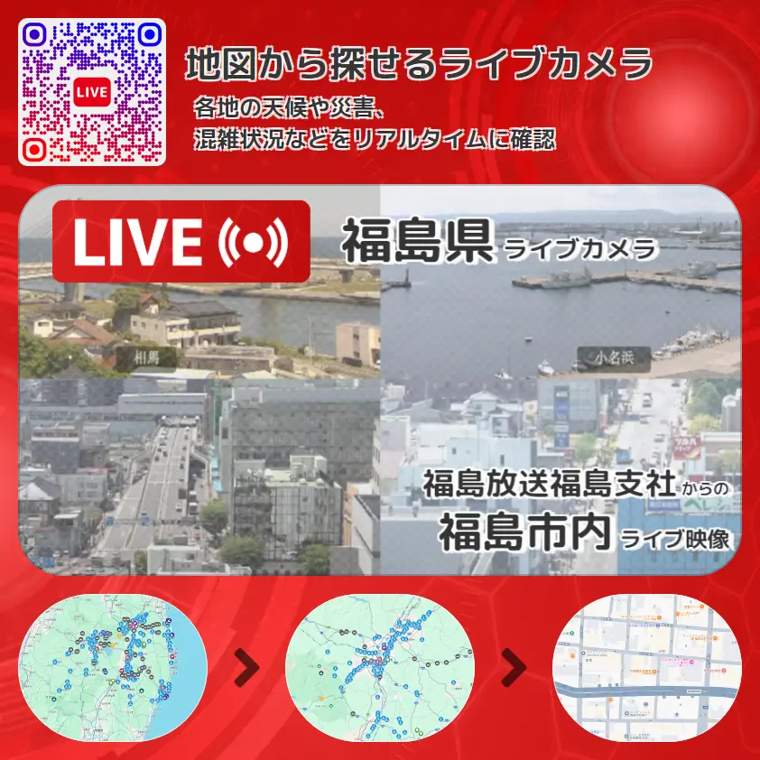 福島市内の他に、国道13号(平和通り・信夫通り)や周辺の気象状況も併せてチェックすることが可能で、台風・大雨・地震などの災害による被害状況も把握することができます。