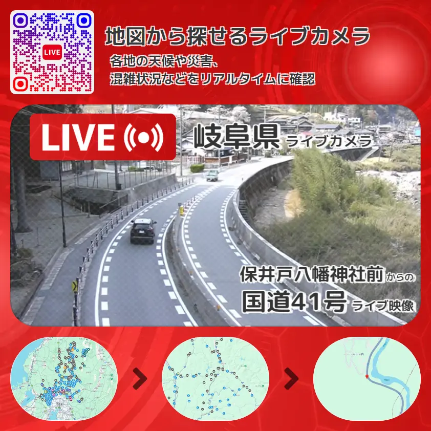 国道41号(益田街道)の他に、飛騨川や周辺の気象状況も併せてチェックすることが可能で、台風・大雨・地震などの災害による被害状況も把握することができます。