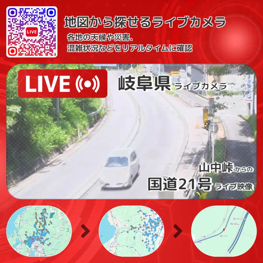 国道21号の他に、山中峠や周辺の気象状況も併せてチェックすることが可能で、台風・大雨・地震などの災害による被害状況も把握することができます。
