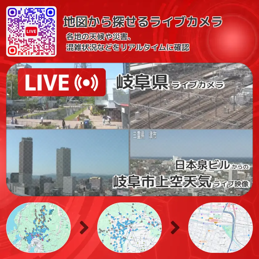 岐阜市上空天気の他に、JR岐阜駅(東海道本線・高山本線・ひだ・しらさぎ)や周辺の気象状況も併せてチェックすることが可能で、台風・大雨・地震などの災害による被害状況も把握することができます。