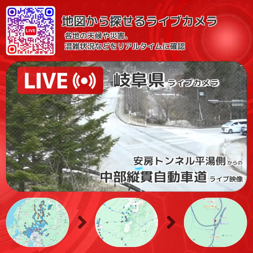 中部縦貫自動車道(中部縦貫道)の他に、国道158号(安房峠道路)や周辺の気象状況も併せてチェックすることが可能で、台風・大雨・地震などの災害による被害状況も把握することができます。