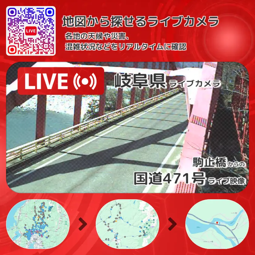 国道471号(岐阜県の花街道奥飛騨湯の花街道)の他に、駒止橋や周辺の気象状況も併せてチェックすることが可能で、台風・大雨・地震などの災害による被害状況も把握することができます。