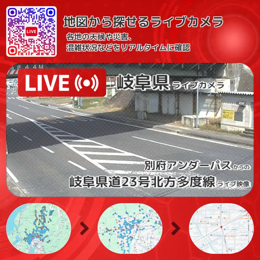 岐阜県道23号北方多度線の他に、別府アンダーパスや周辺の気象状況も併せてチェックすることが可能で、台風・大雨・地震などの災害による被害状況も把握することができます。