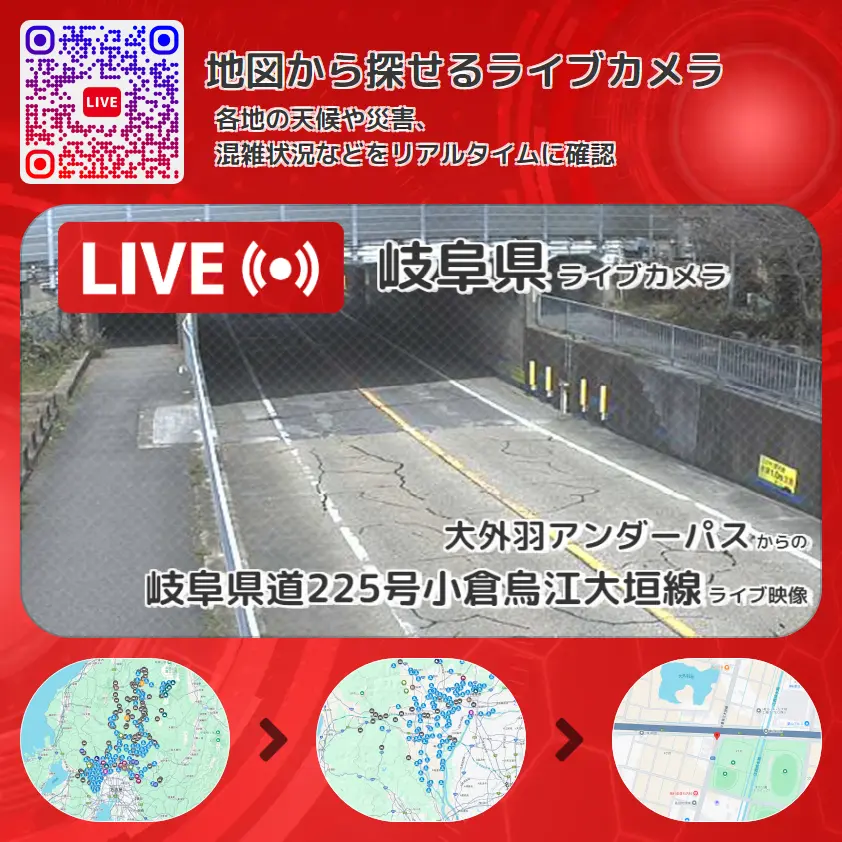 岐阜県道225号小倉烏江大垣線の他に、大外羽アンダーパスや周辺の気象状況も併せてチェックすることが可能で、台風・大雨・地震などの災害による被害状況も把握することができます。