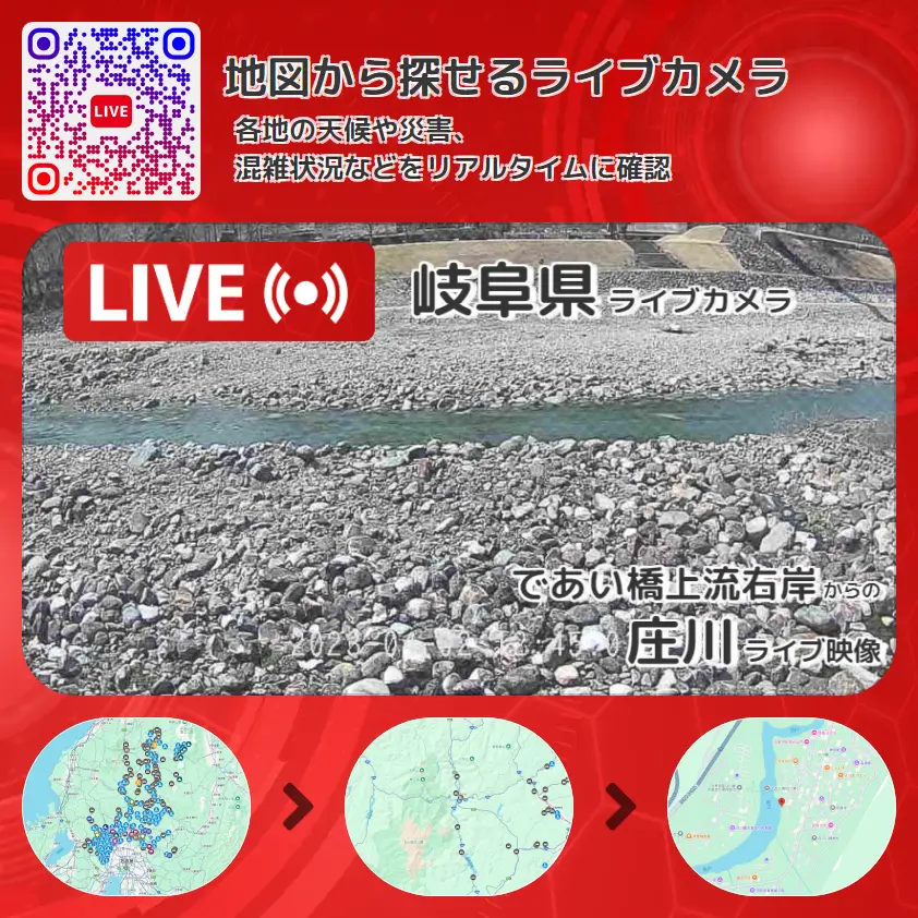 庄川の他に、白川郷合掌造り(世界遺産)や周辺の気象状況も併せてチェックすることが可能で、台風・大雨・地震などの災害による被害状況も把握することができます。