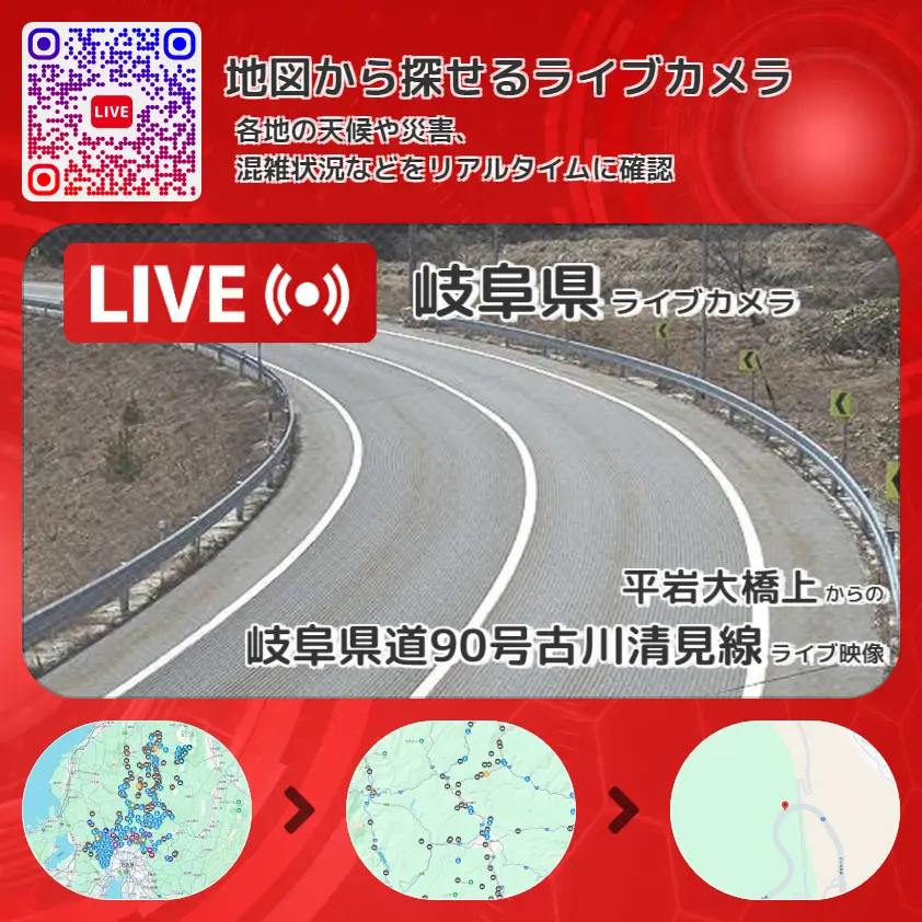 岐阜県道90号古川清見線の他に、平岩大橋や周辺の気象状況も併せてチェックすることが可能で、台風・大雨・地震などの災害による被害状況も把握することができます。