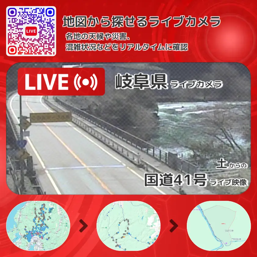 周辺の気象状況も併せてチェックすることが可能で、台風・大雨・地震などの災害による被害状況も把握することができます。