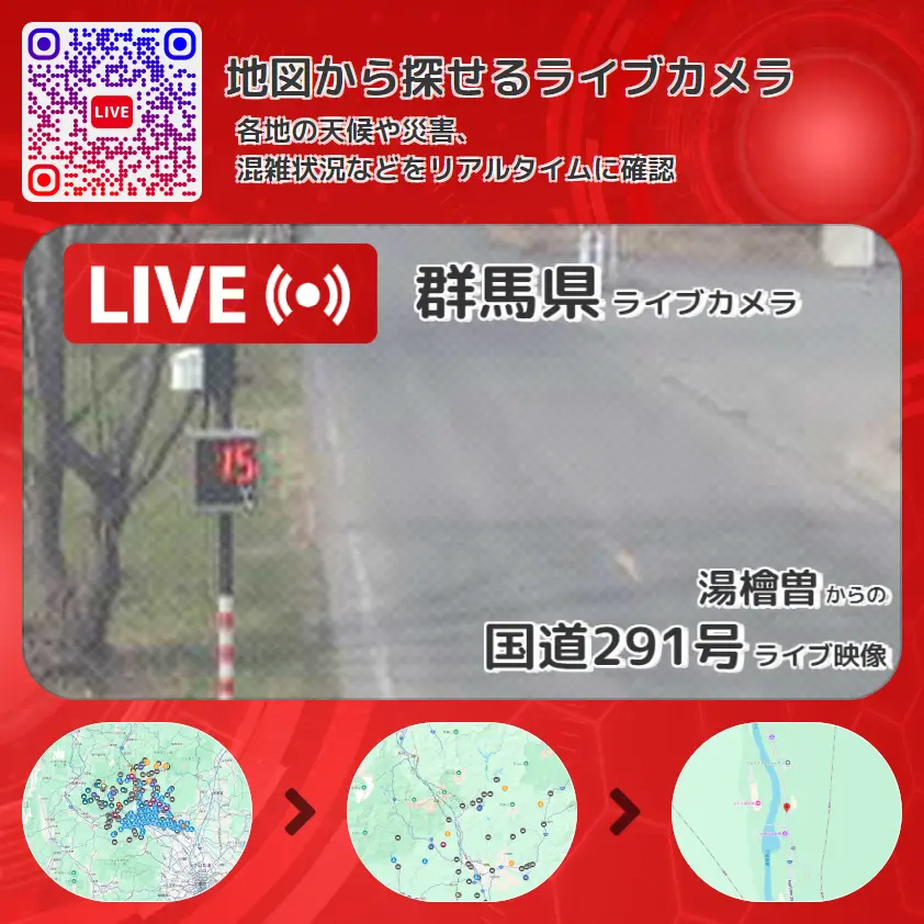 国道291号の他に、湯檜曽川や周辺の気象状況も併せてチェックすることが可能で、台風・大雨・地震などの災害による被害状況も把握することができます。