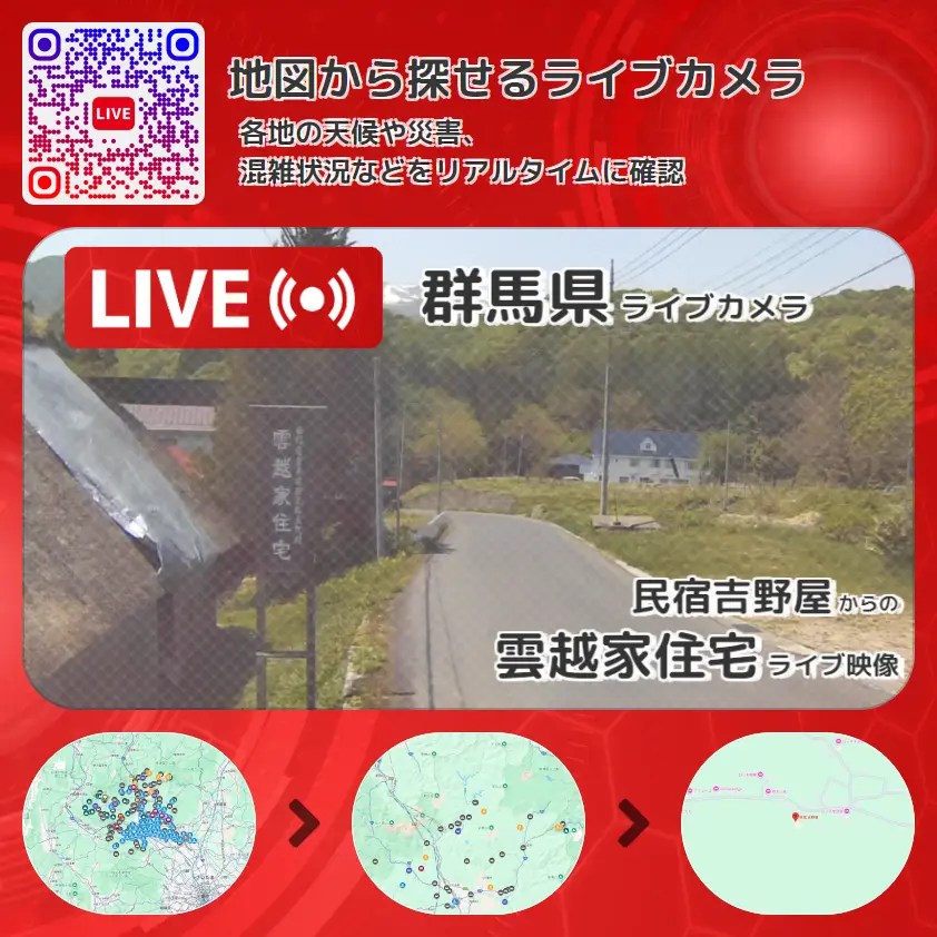 雲越家住宅(雲越家住宅資料館)の他に、朝日岳や周辺の気象状況も併せてチェックすることが可能で、台風・大雨・地震などの災害による被害状況も把握することができます。