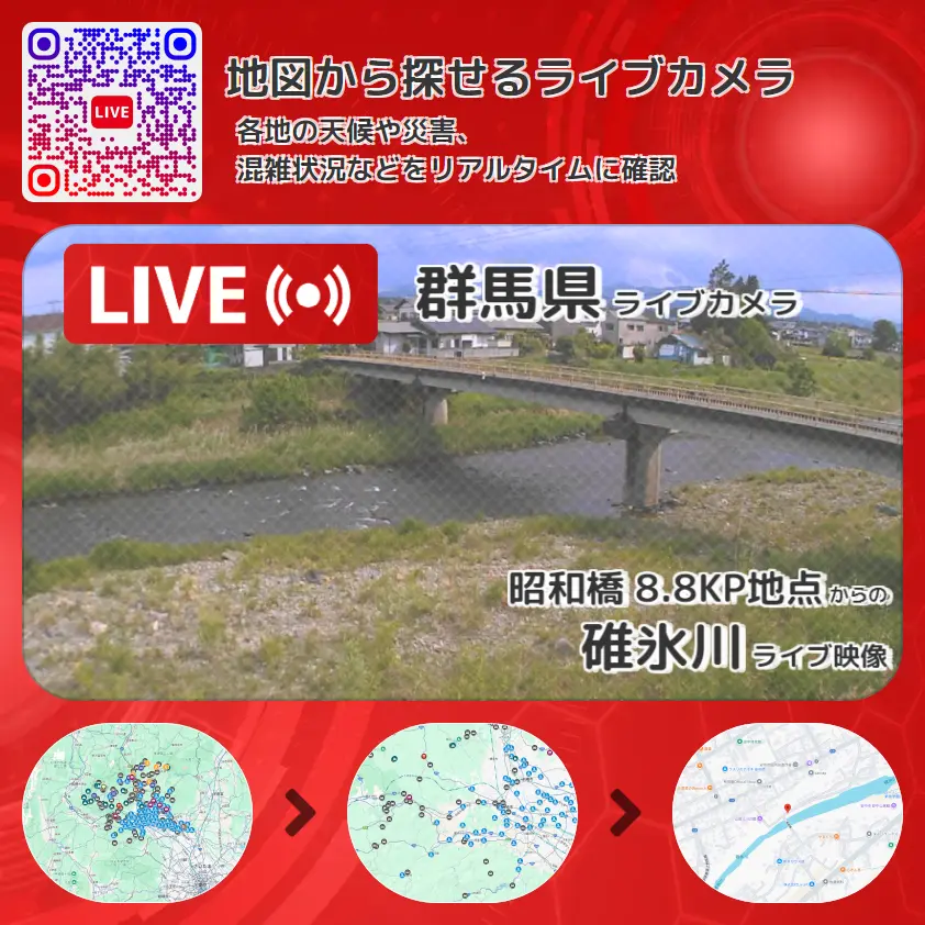 碓氷川の他に、昭和橋や周辺の気象状況も併せてチェックすることが可能で、台風・大雨・地震などの災害による被害状況も把握することができます。