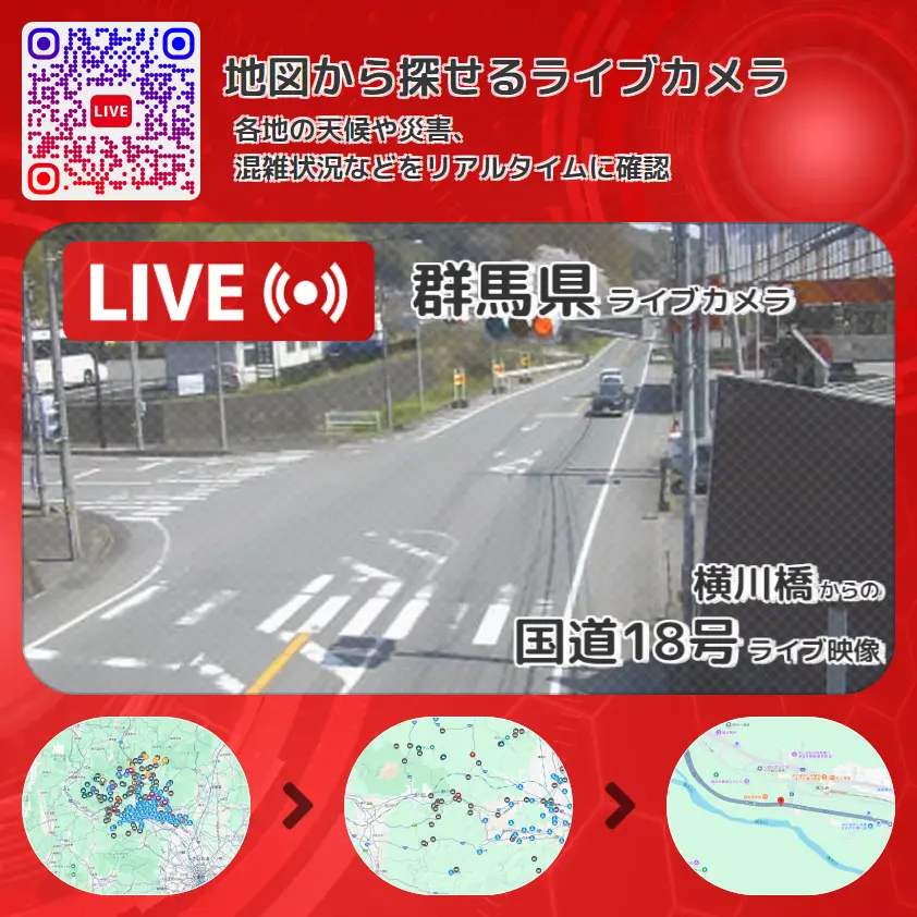 国道18号(中山道)の他に、群馬県道92号松井田軽井沢線や周辺の気象状況も併せてチェックすることが可能で、台風・大雨・地震などの災害による被害状況も把握することができます。