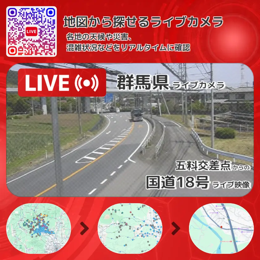 国道18号(中山道)の他に、五料交差点や周辺の気象状況も併せてチェックすることが可能で、台風・大雨・地震などの災害による被害状況も把握することができます。