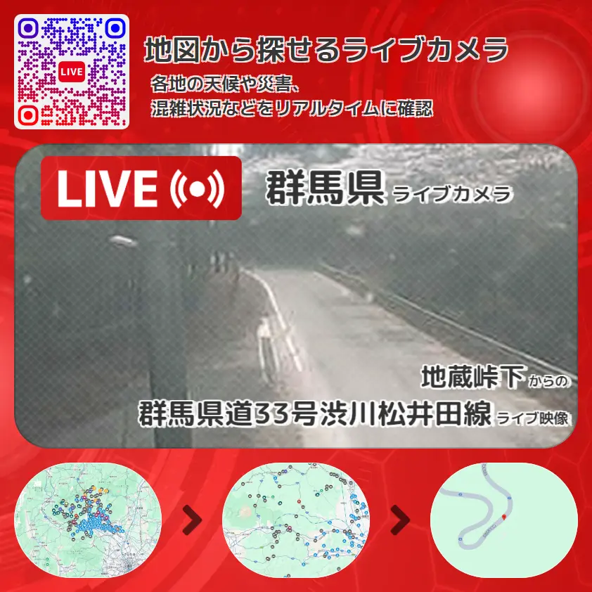 群馬県道33号渋川松井田線の他に、地蔵峠や周辺の気象状況も併せてチェックすることが可能で、台風・大雨・地震などの災害による被害状況も把握することができます。