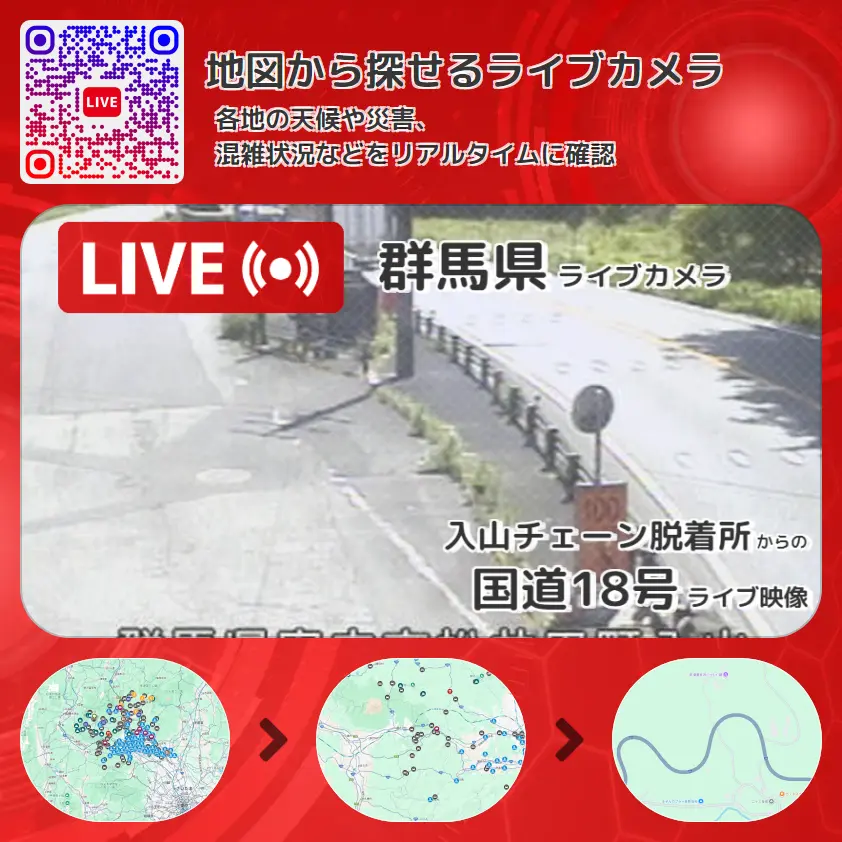 国道18号(碓氷バイパス)の他に、入山峠(標高580m地点)や周辺の気象状況も併せてチェックすることが可能で、台風・大雨・地震などの災害による被害状況も把握することができます。
