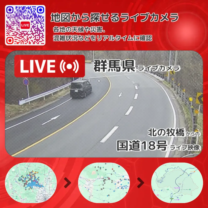国道18号(碓氷バイパス)の他に、北の牧橋や周辺の気象状況も併せてチェックすることが可能で、台風・大雨・地震などの災害による被害状況も把握することができます。
