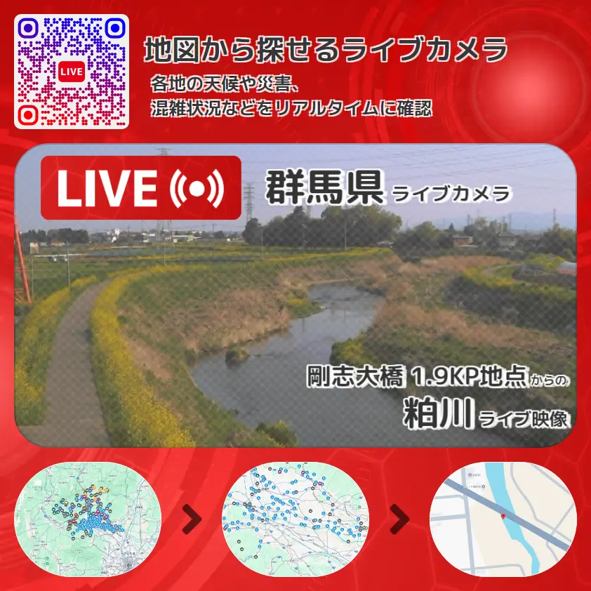 粕川の他に、国道354号(東毛広域幹線道路)付近や周辺の気象状況も併せてチェックすることが可能で、台風・大雨・地震などの災害による被害状況も把握することができます。