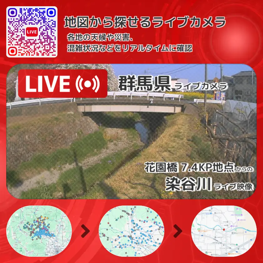 染谷川の他に、花園橋や周辺の気象状況も併せてチェックすることが可能で、台風・大雨・地震などの災害による被害状況も把握することができます。