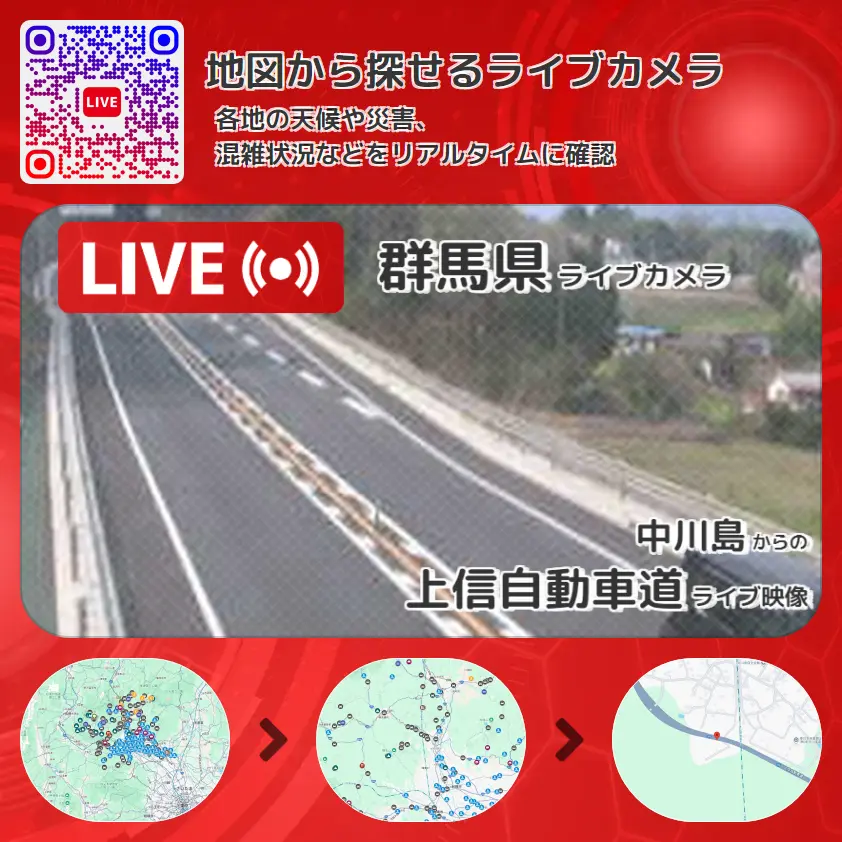 上信自動車道(上信道)の他に、国道353号(川島バイパス)や周辺の気象状況も併せてチェックすることが可能で、台風・大雨・地震などの災害による被害状況も把握することができます。