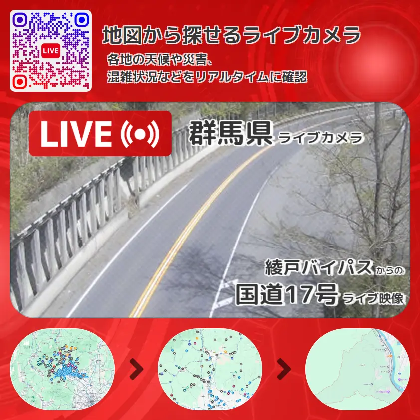 国道17号(綾戸バイパス)の他に、国道291号や周辺の気象状況も併せてチェックすることが可能で、台風・大雨・地震などの災害による被害状況も把握することができます。