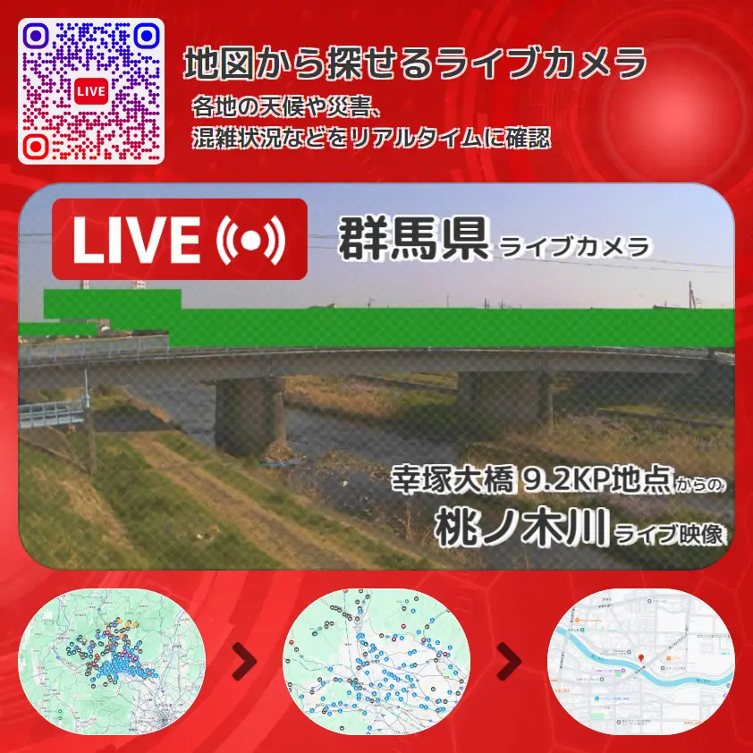 桃ノ木川(桃の木川・桃木川)の他に、幸塚大橋や周辺の気象状況も併せてチェックすることが可能で、台風・大雨・地震などの災害による被害状況も把握することができます。