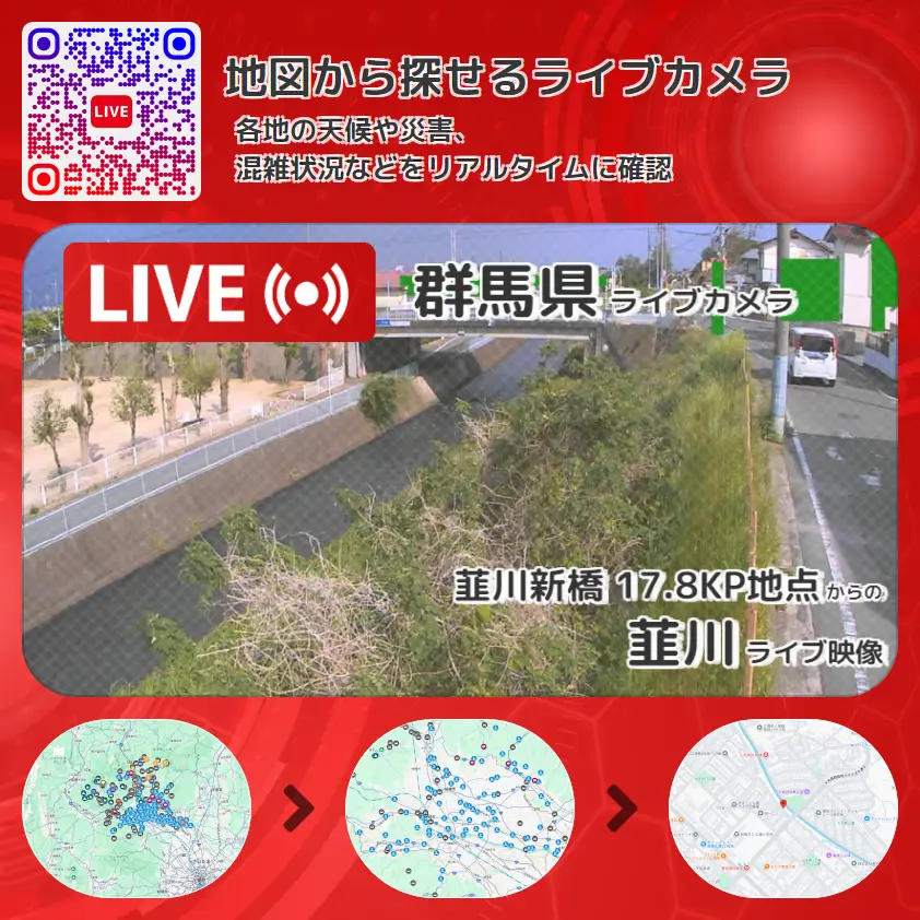 韮川の他に、韮川新橋や周辺の気象状況も併せてチェックすることが可能で、台風・大雨・地震などの災害による被害状況も把握することができます。