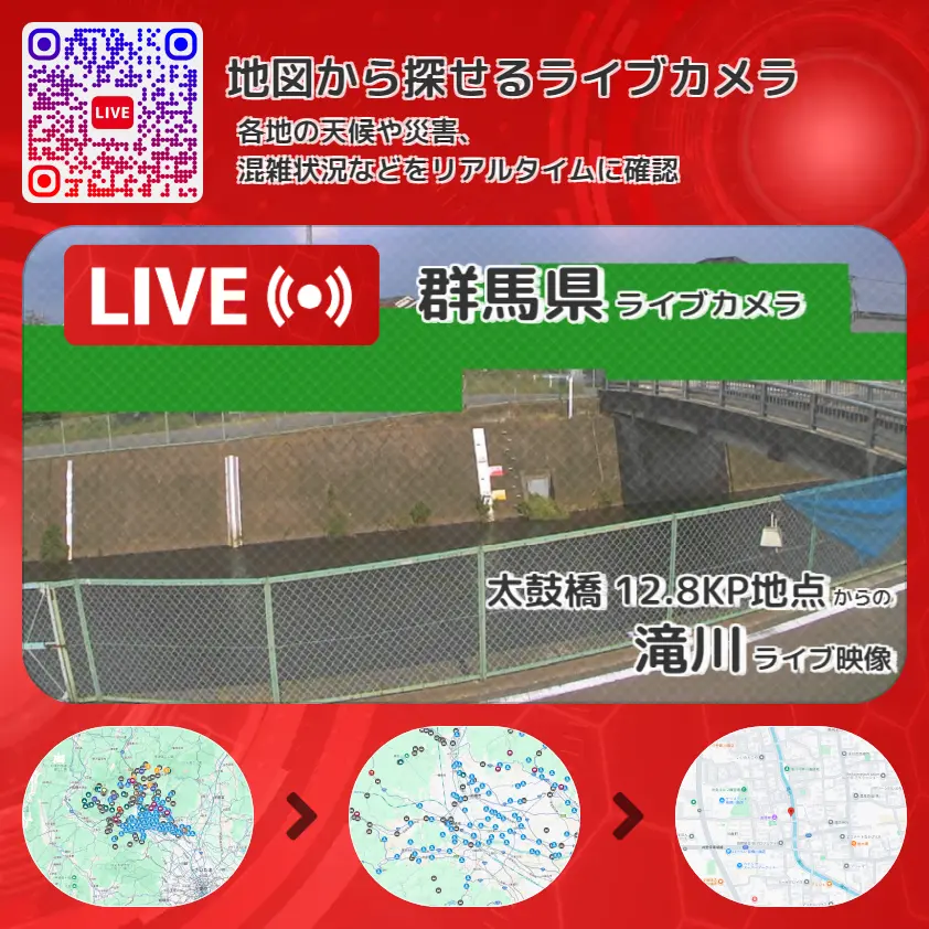 滝川の他に、太鼓橋や周辺の気象状況も併せてチェックすることが可能で、台風・大雨・地震などの災害による被害状況も把握することができます。