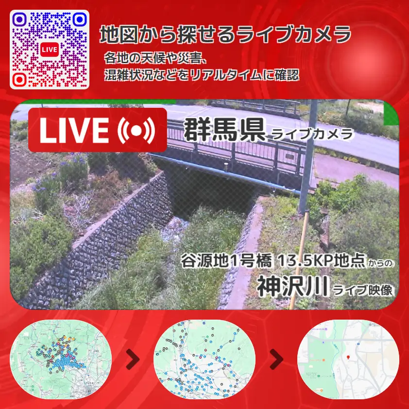 神沢川の他に、谷源地1号橋や周辺の気象状況も併せてチェックすることが可能で、台風・大雨・地震などの災害による被害状況も把握することができます。