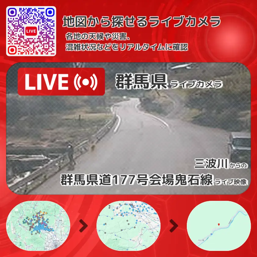 群馬県道177号会場鬼石線の他に、三波川や周辺の気象状況も併せてチェックすることが可能で、台風・大雨・地震などの災害による被害状況も把握することができます。