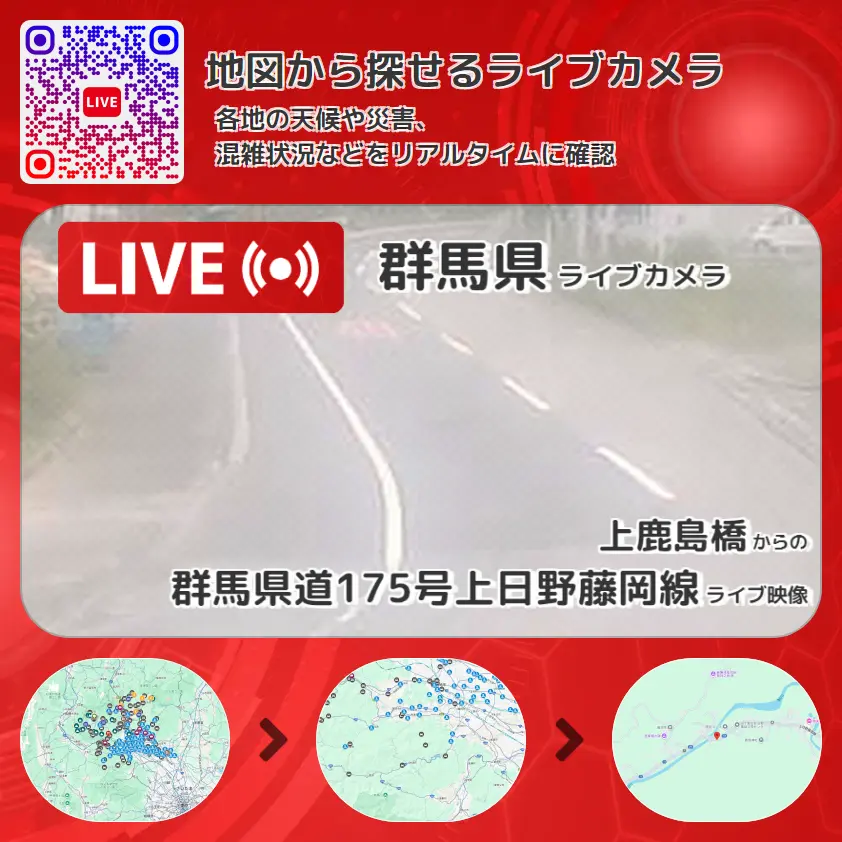 群馬県道175号上日野藤岡線の他に、鮎川付近や周辺の気象状況も併せてチェックすることが可能で、台風・大雨・地震などの災害による被害状況も把握することができます。