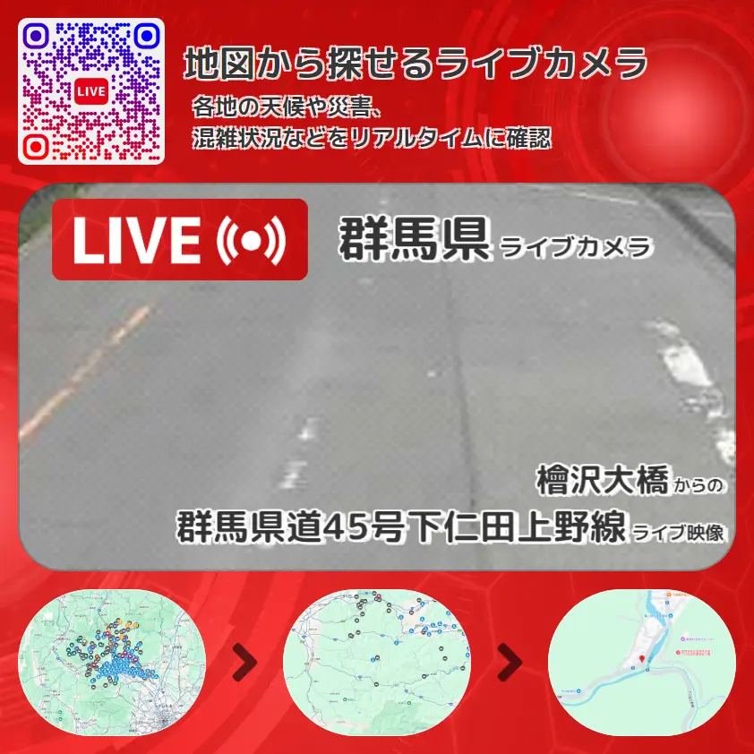 群馬県道45号下仁田上野線(西上州やまびこ街道)の他に、群馬県道93号下仁田臼田線や周辺の気象状況も併せてチェックすることが可能で、台風・大雨・地震などの災害による被害状況も把握することができます。