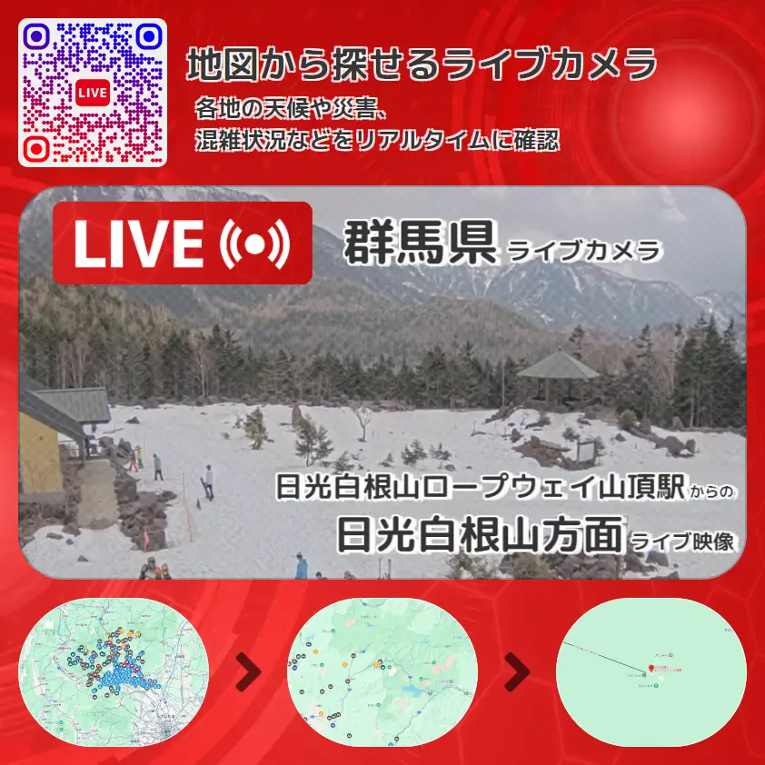日光白根山方面の他に、天空の足湯や周辺の気象状況も併せてチェックすることが可能で、台風・大雨・地震などの災害による被害状況も把握することができます。