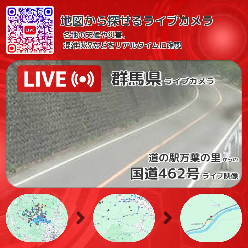 国道462号(十石峠街道)の他に、神流川滝の沢川合流地点方面や周辺の気象状況も併せてチェックすることが可能で、台風・大雨・地震などの災害による被害状況も把握することができます。