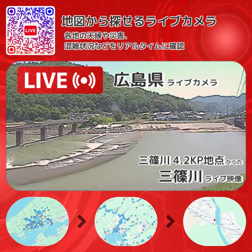 三篠川の他に、広島県道37号広島三次線や周辺の気象状況も併せてチェックすることが可能で、台風・大雨・地震などの災害による被害状況も把握することができます。