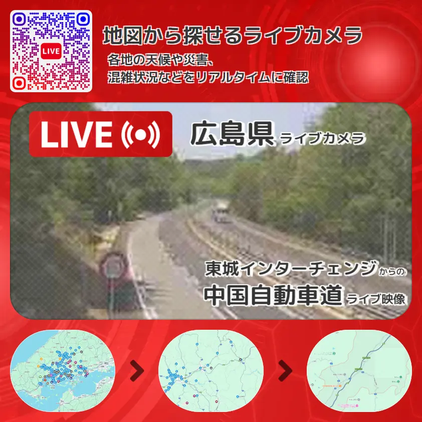 東城インターチェンジ(東城IC)~庄原インターチェンジ(庄原IC)から、中国自動車道(中国道)が確認できるライブカメラです。