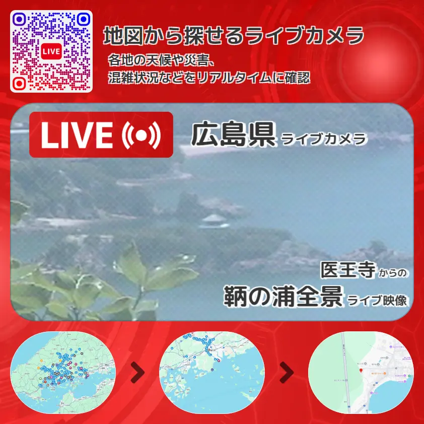 鞆の浦全景の他に、鞆港や周辺の気象状況も併せてチェックすることが可能で、台風・大雨・地震などの災害による被害状況も把握することができます。