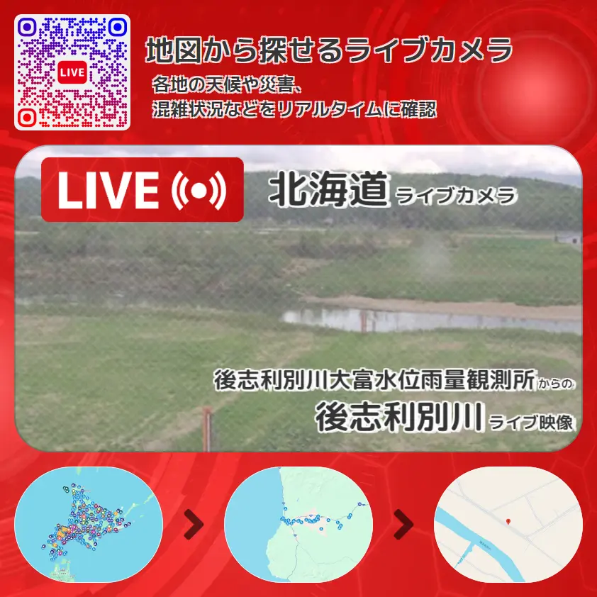 後志利別川の他に、トンケ川や周辺の気象状況も併せてチェックすることが可能で、台風・大雨・地震などの災害による被害状況も把握することができます。