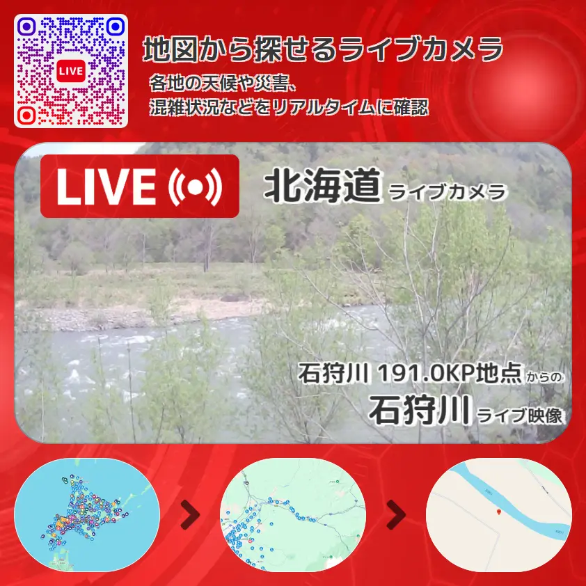 周辺の気象状況も併せてチェックすることが可能で、台風・大雨・地震などの災害による被害状況も把握することができます。