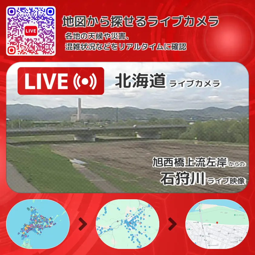 石狩川の他に、旭西橋や周辺の気象状況も併せてチェックすることが可能で、台風・大雨・地震などの災害による被害状況も把握することができます。