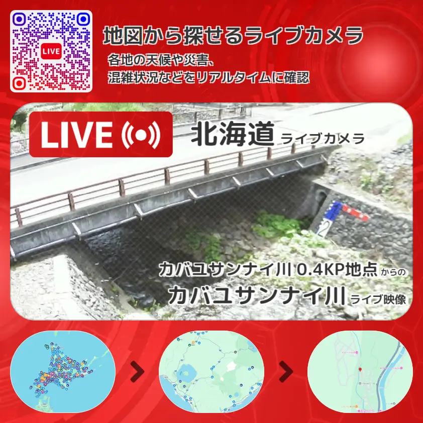 カバユサンナイ川の他に、白樺橋や周辺の気象状況も併せてチェックすることが可能で、台風・大雨・地震などの災害による被害状況も把握することができます。