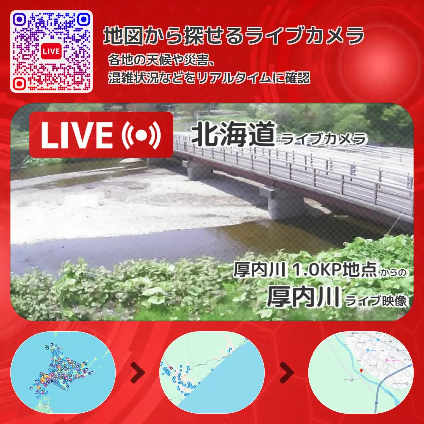 厚内川の他に、厚内橋や周辺の気象状況も併せてチェックすることが可能で、台風・大雨・地震などの災害による被害状況も把握することができます。