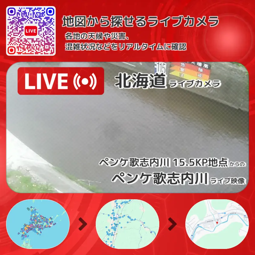 ペンケ歌志内川(ペンケウタシナイ川)の他に、ペンケ歌志内川梅の沢川合流地点付近や周辺の気象状況も併せてチェックすることが可能で、台風・大雨・地震などの災害による被害状況も把握することができます。