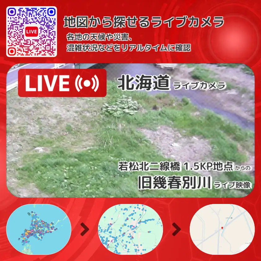 旧幾春別川の他に、若松北二線橋や周辺の気象状況も併せてチェックすることが可能で、台風・大雨・地震などの災害による被害状況も把握することができます。